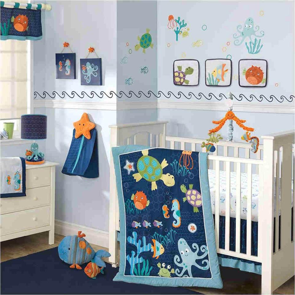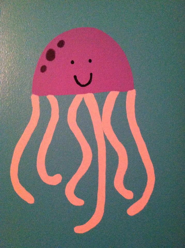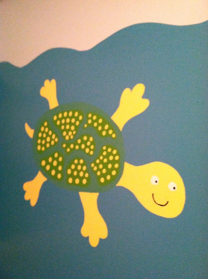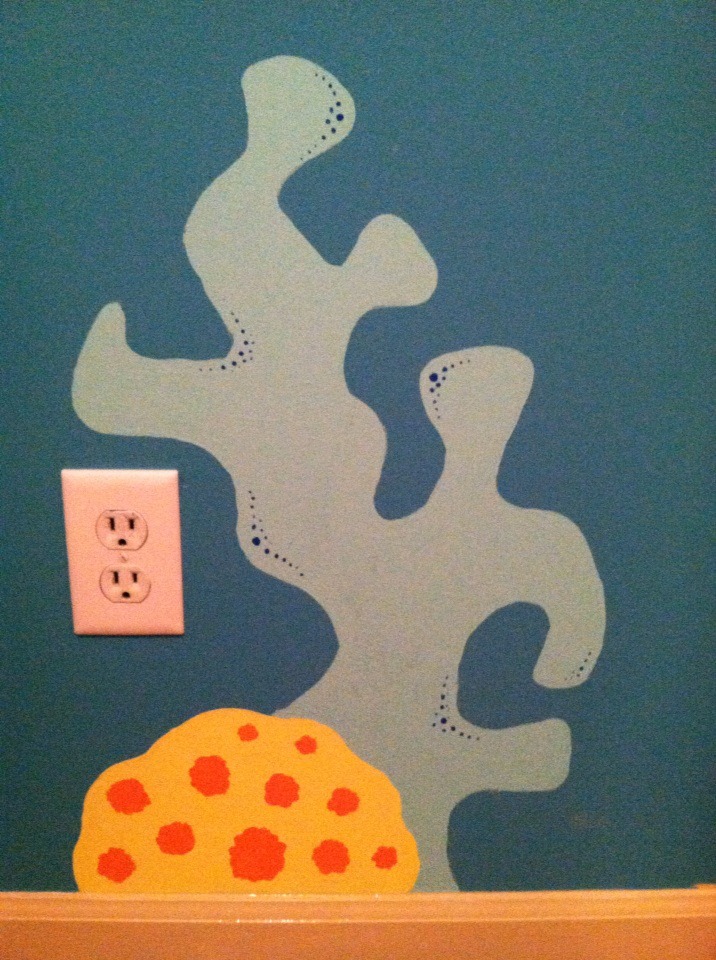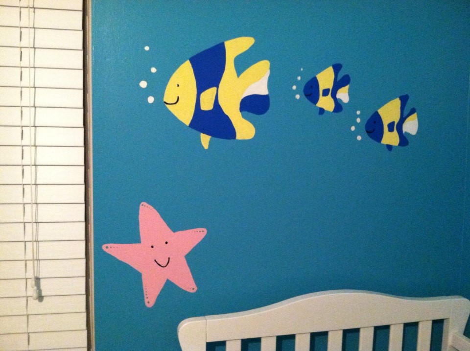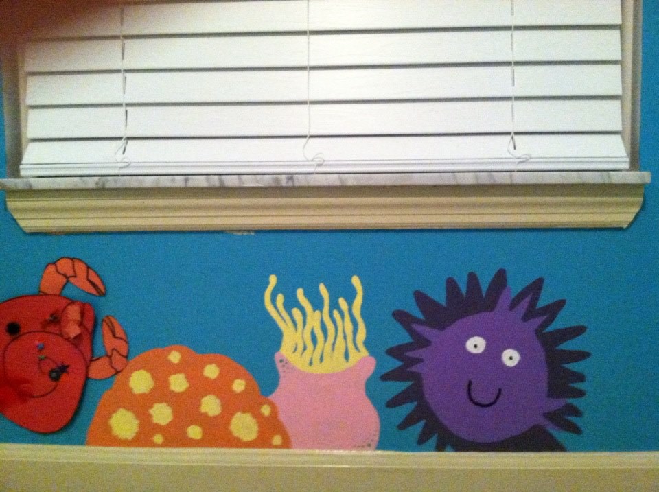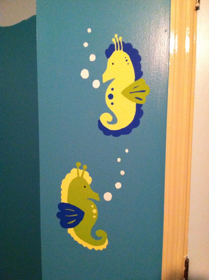Shantal went in the weekend before and painted the walls blue with pretty waves, so I just had to embellish with the characters from the crib set. I had a field day! We painted the turtle, octopus (which only had 6 legs), pufferfish, jellyfish, crab, seahorses, starfish, coral, seaweed, and assorted other fish PLUS we added a sea anemone and sea urchin to the mix.
