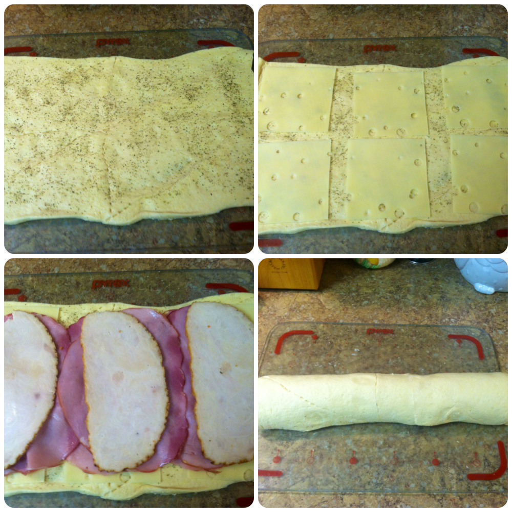 (2) Sprinkle with Italian seasoning and a little salt and pepper. Layer the Swiss cheese, then ham, and finally the chicken. Roll it all up, starting with a long side, and cut into 8 rolls.